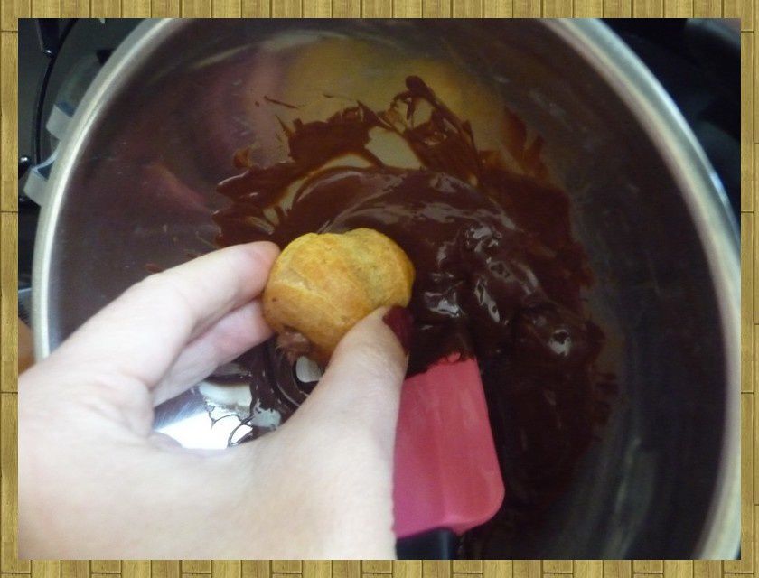- Faire fondre le chocolat noir au bain marie puis tremper les petits choux dedans.