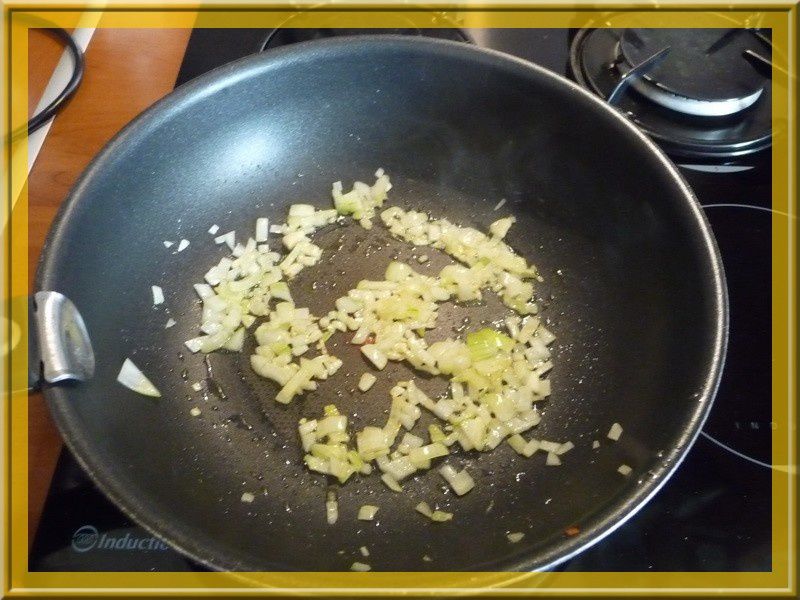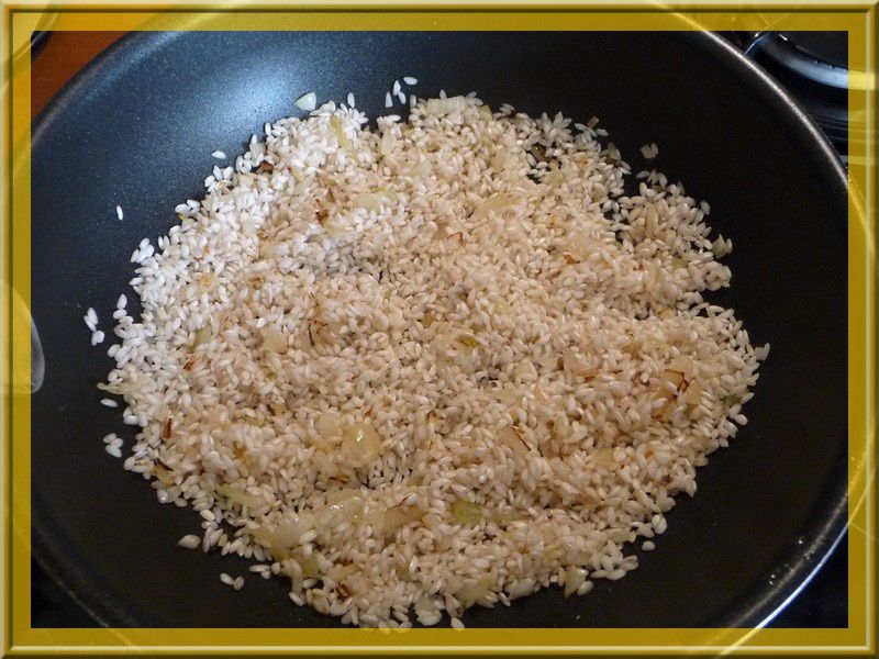 - Hacher les 2 oignons et les faire suer dans un peu d’huile d’olives, puis ajouter le riz.