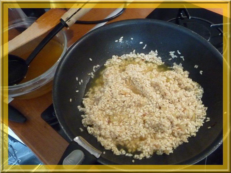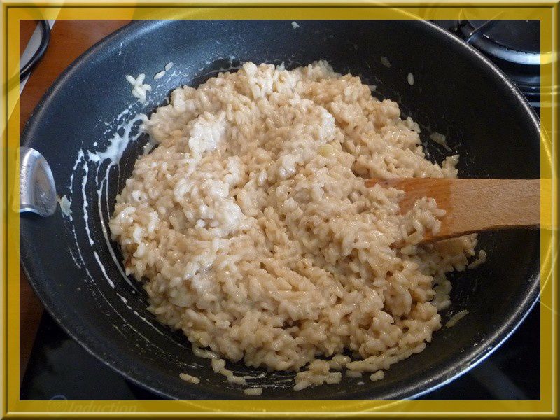- Baisser votre feu au minimum, quand le riz est translucide y ajouter le vin blanc laisser réduire.