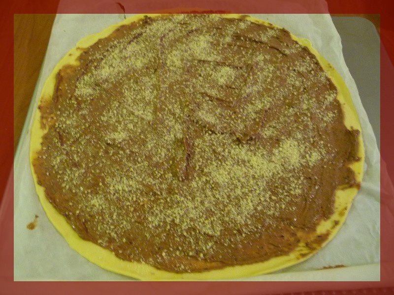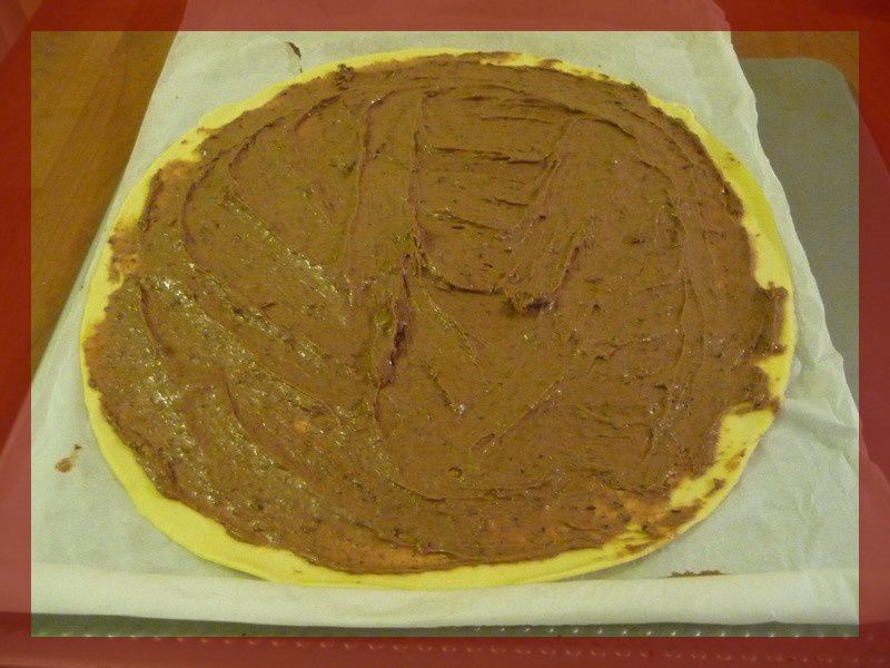 - Dérouler une pâte feuilletée puis étaler le chocolat, saupoudrer de poudre d’amandes.