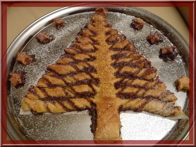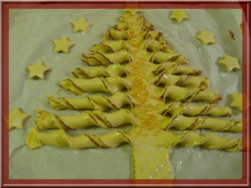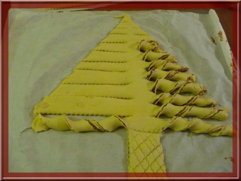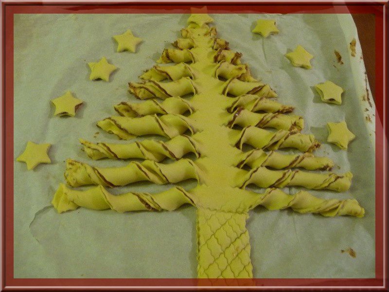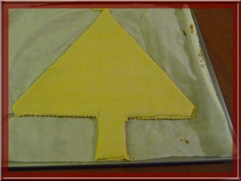 - Recouvrir avec la seconde pâte feuilletée, découper en forme de sapin (Voir les photographies pour le tutoriel)