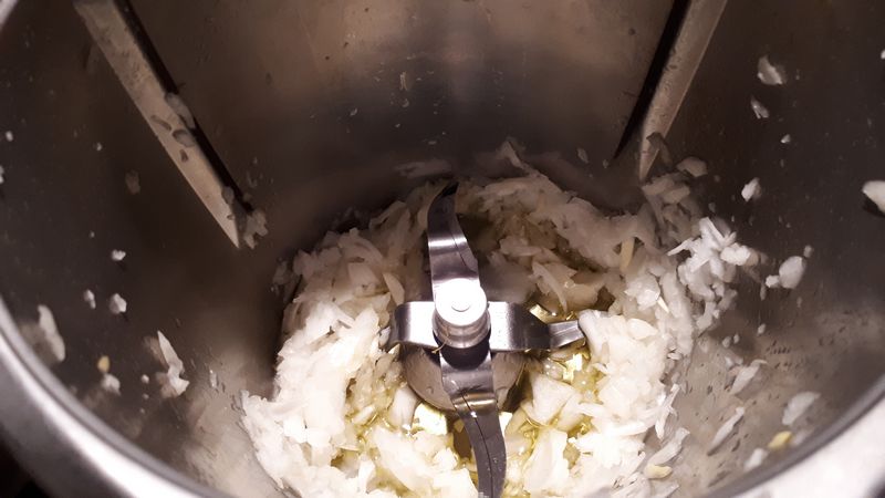 - Éplucher et couper les oignons en deux, les mettre dans la bol et mixer 4sec/ vitesse5