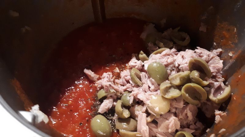 - Ajouter le thon égoutté et les olives coupées en deux, mélanger et laisser chauffer environ 5 minutes.