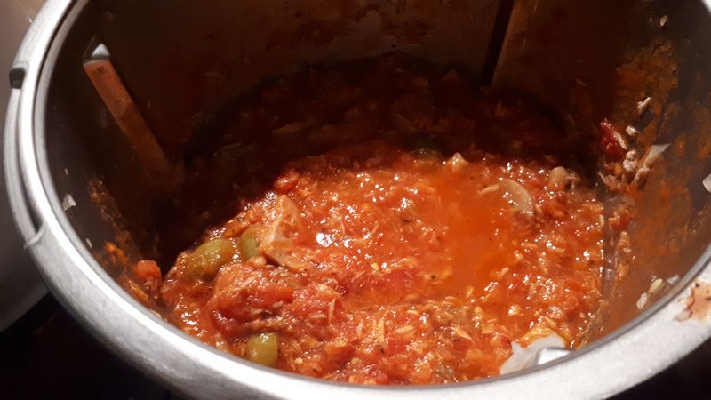 - A la sonnerie ajouter le thon émietté, les olives coupées en deux et cuire 5min/100°C/ fonction sens inverse/vitesse1. Réserver au chaud.