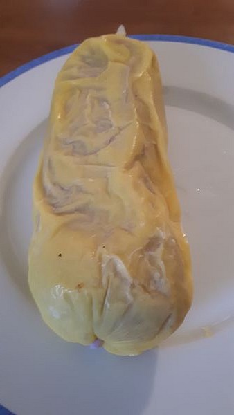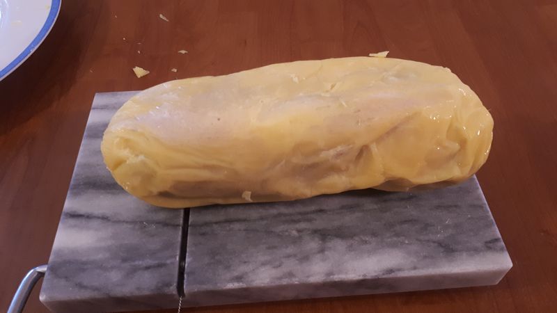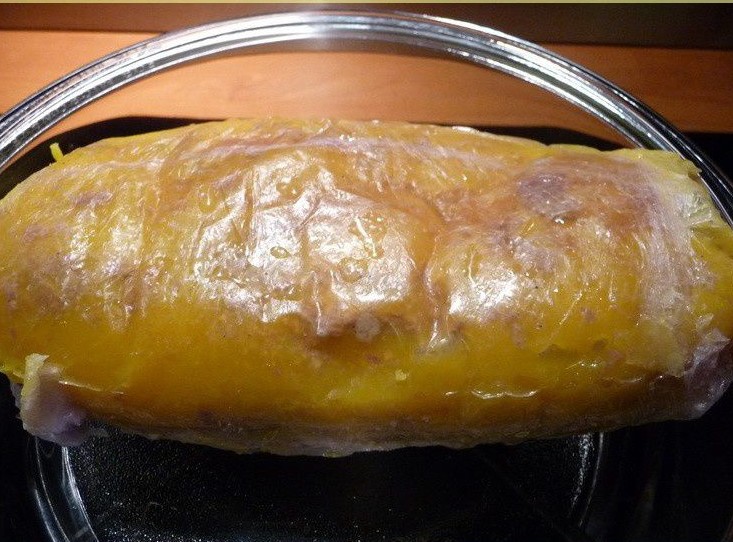 6. Reconstituer le foie à la main et le déposer au centre d’une feuille de film alimentaire transparent de 50 cm de côté environ et rabattre les côtés du film en évacuant bien l’air afin de former un saucisson. Renouveler l’opération dans 4 autres feuilles en serrant bien les côtés et faire un nœud sur les côtés avec la dernière feuille.