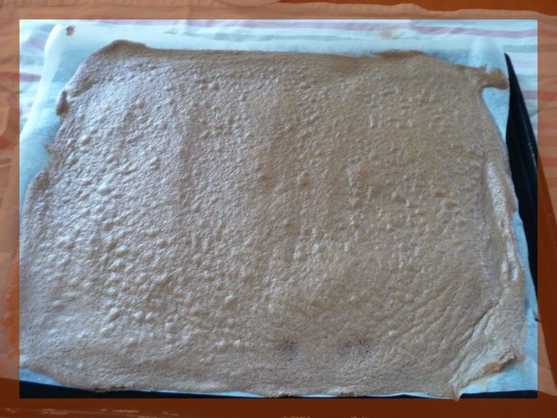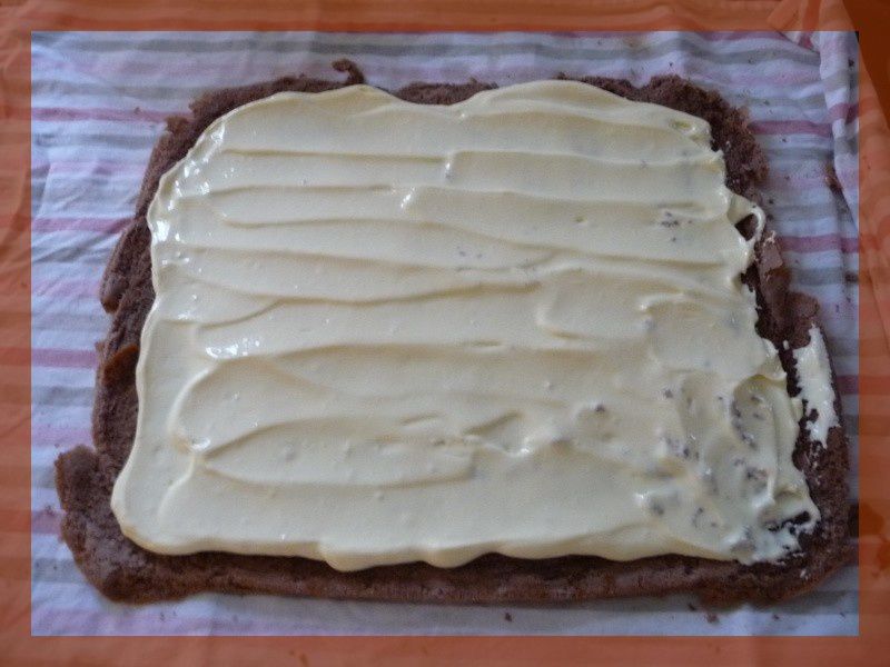 - Dérouler le biscuit sur la feuille de cuisson, l’imbiber avec le mélange café-Amaretto puis recouvrir de crème.