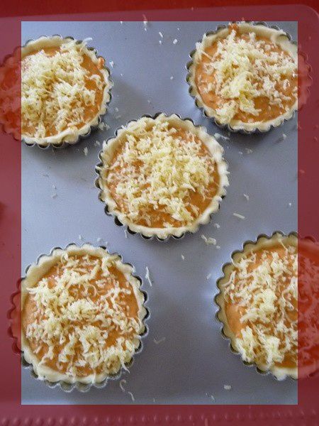 - Abaisser votre pâte dans vos moules, piquer légèrement le fond, puis mettre la préparation et parsemer de comté râpé.