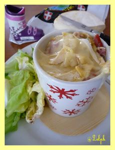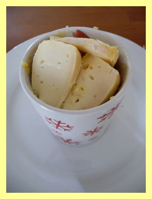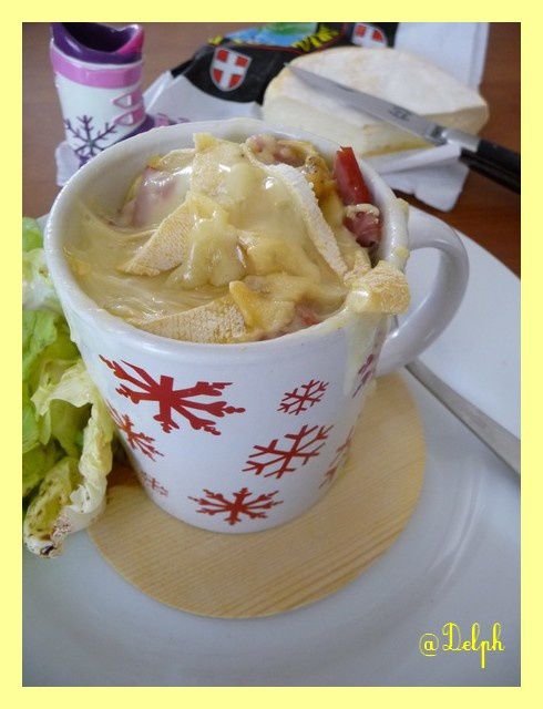 - En laissant le mug dans le four à micro-onde, déposer la tranche de Reblochon sur le mug et faire cuire de nouveau 30 secondes.