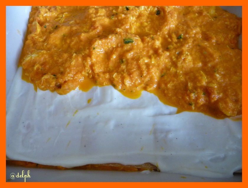 - Déposer 3 feuilles de lasagne côte-à -côte dans un plat à gratin huilé et couvrir d’une couche de crème et d’une couche de carotte/poulet, renouveler l’opération 1 fois et terminer par une couche de lasagnes, ajouter le reste de crème par-dessus, parsemer d’emmental râpé et faire chauffer au four 20 minutes , mettre les 5 dernières minutes à 220°c pour faire gratiner votre plat.