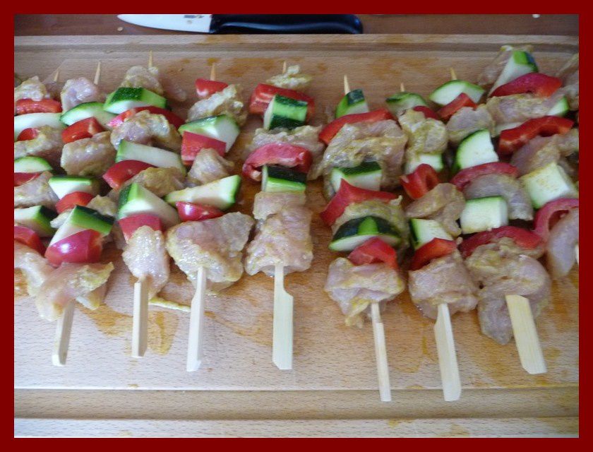 - Sur des pics à brochette, alterner des cubes de poulet, les dés de poivron et les dés de courgette.