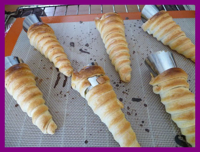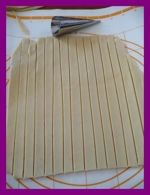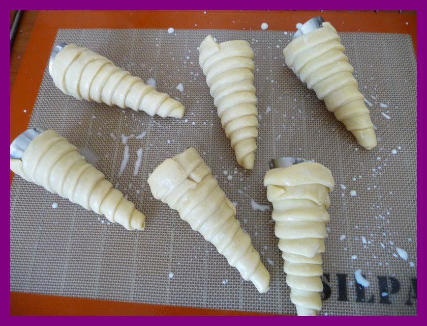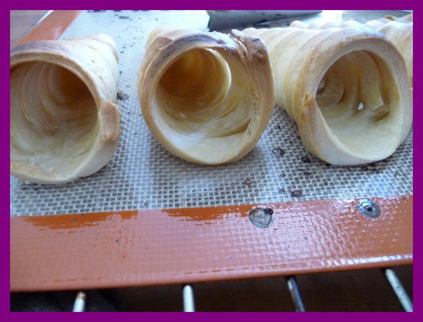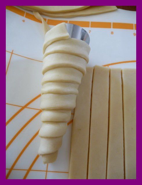 - A l’aide d’un pinceau, beurrer 6 moules à cornet, couper la pâte brisée en lamelle de 1,5 cm et les enrouler autour du cornet, appuyer bien sur les jointures pour éviter que le cornet ne s’ouvre durant la cuisson.