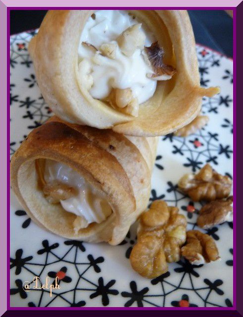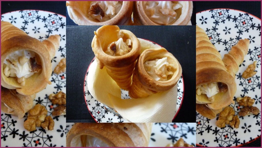 - A l’aide de la poche à douille remplir les cornets de mousse et les décorer de noix.