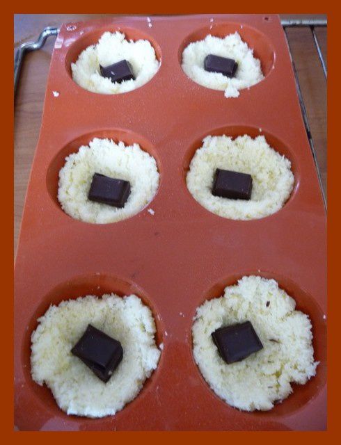 - Remplir les moules à moitié, disposer 2 carreaux de chocolat, compléter avec le reste de la pâte, lisser avec une cuillère.