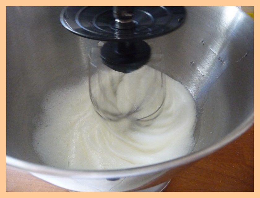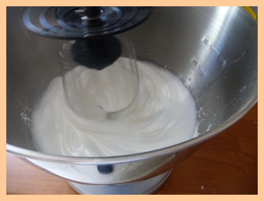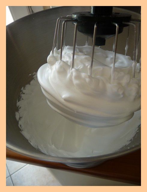 - Au batteur monter les blancs en neige. Il faut commencer doucement et augmenter la vitesse progressivement.Quand ils sont mousseux, ajouter le sucre en poudre en plusieurs fois et le colorant (j’ai pris du blanc). Continuer a monter les blancs jusqu’à ce qu’ils soient très fermes. (Environ 15 minutes)
