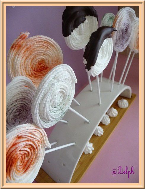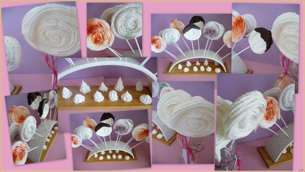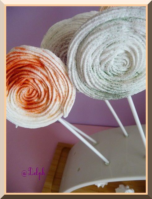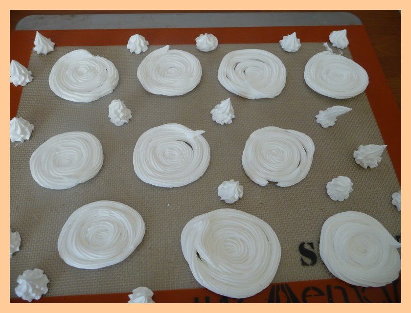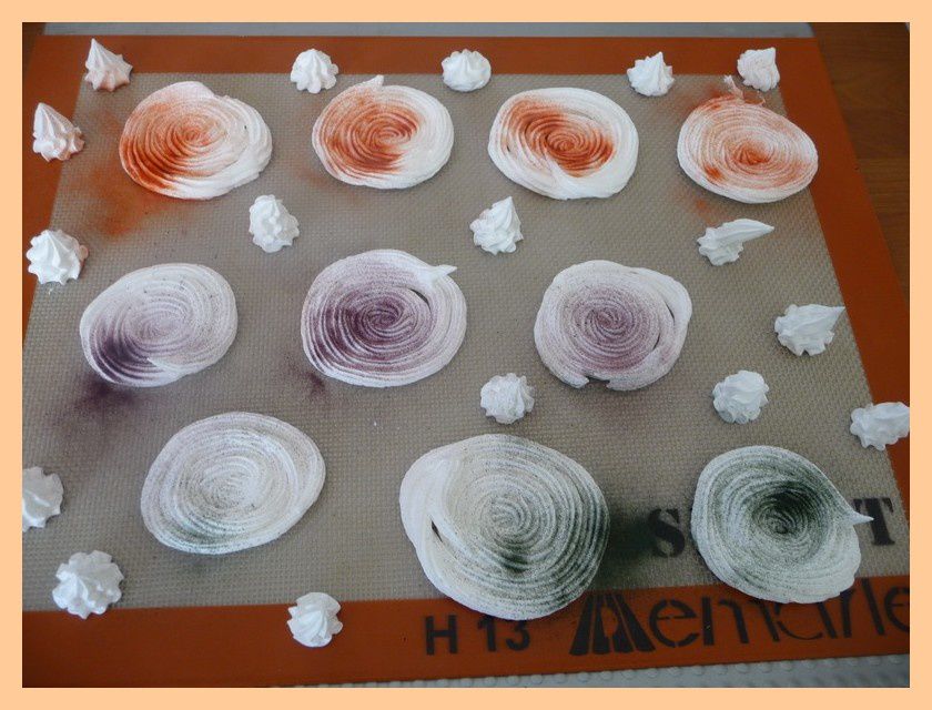 - Mettre la préparation dans une poche munie d’une douille cannelée. faire des spirales serrées en partant du centre pour faire des roses sur une silpat ou un papier cuisson adapté. (J’ai saupoudré de colorant avec une passoire pour obtenir cet effet, mais si vous n’aimez pas vous mettez votre colorant de la couleur de votre choix au moment où vous montez les blancs.°