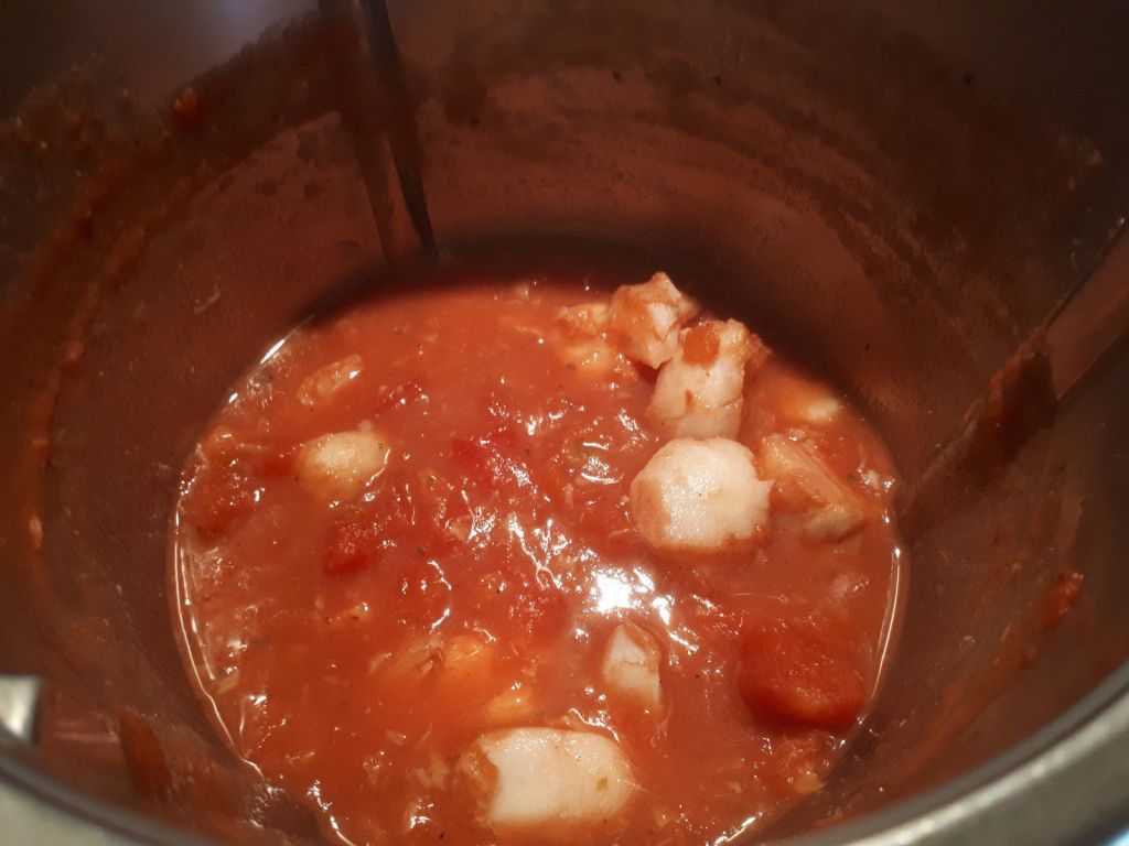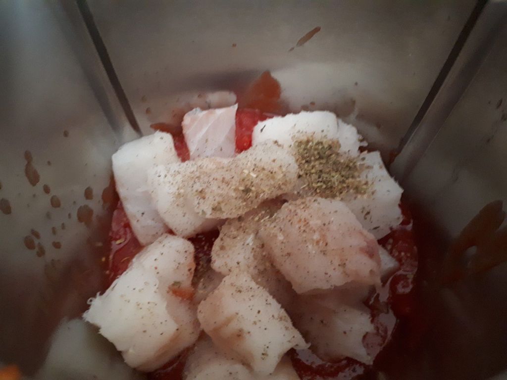 - Mettre dans votre Thermomix, les tomates, le poisson coupé en tronçons d’environ 3 centimètres, le sel, le poivre et l’origan, faire chauffer 10min/100°C/vit1.