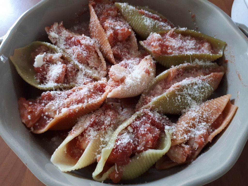 - Farcir les pâtes avec une cuillère à soupe, les disposer dans un plat à gratin, (j’ai mis le jus de tomate qu’il restait au fond du bol, autour des pâtes)parsemer de parmesan râpé puis faire chauffer à 190°C entre 15 et 20 minutes.