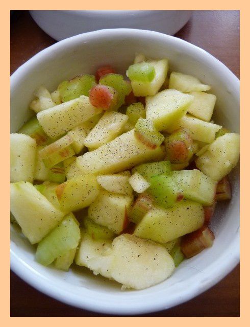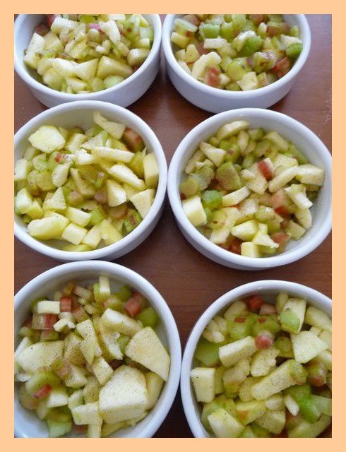 - Éplucher les pommes et les tailler en petits cubes, nettoyer et éplucher les tiges de rhubarbe et les couper en petits tronçons.