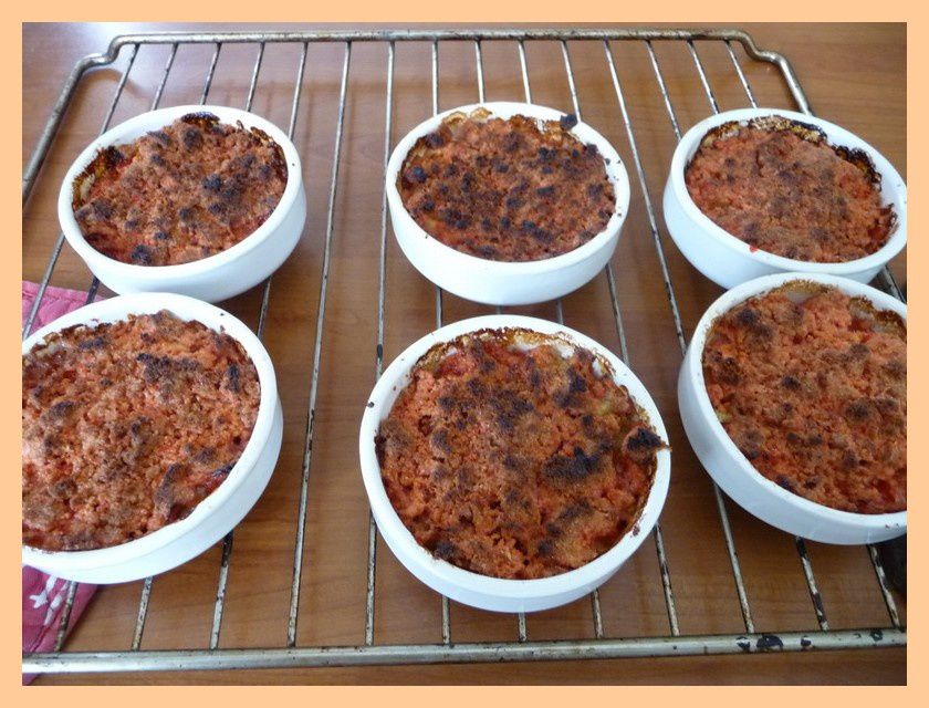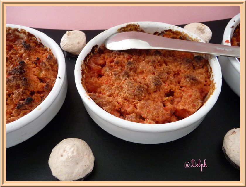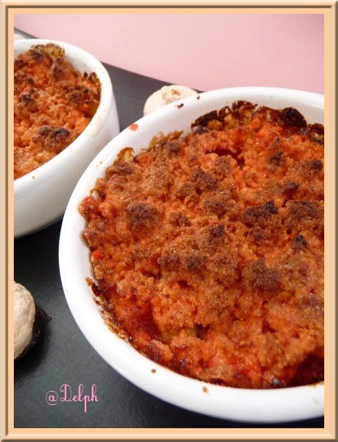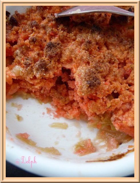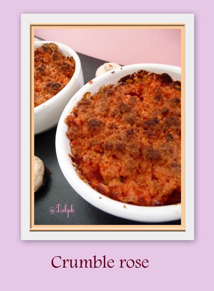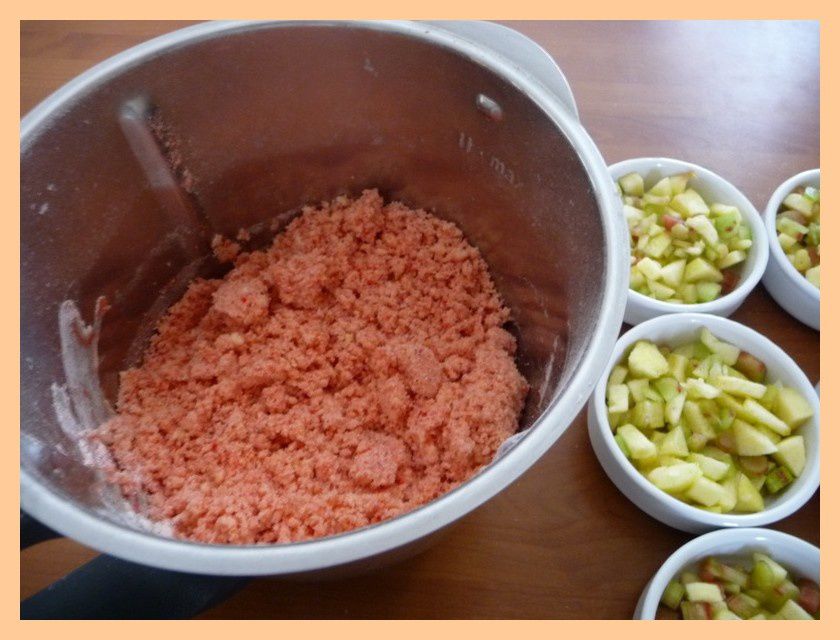 Un petit peu de rhubarbe du potager de ma belle-mère, quelques pommes dans la panière à fruits…Allez hop un petit crumble pour le goûter. Et tout girly grâce à de bonnes pralines roses.