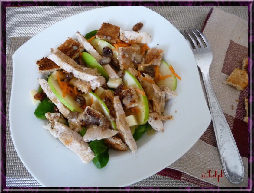 - Sur une assiette, dresser la mâche, les carottes râpées, la pomme, le poulet et l’emmenthal.