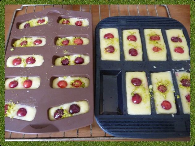 9. Enfoncer légèrement 2 moitiés de cerises dans chaque empreinte, face bombée vers le haut, puis parsemer d’éclats de pistaches.