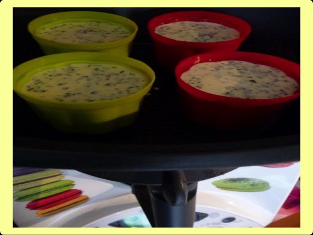- Mettre vos ramequins dans le panier Varoma, positionner votre Varoma et programmer 25-30 mn/Varoma/Vit1. (Le temps est en fonction de la grosseur des vos ramequins).