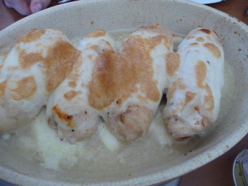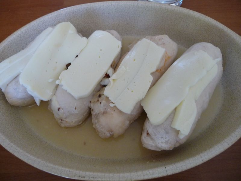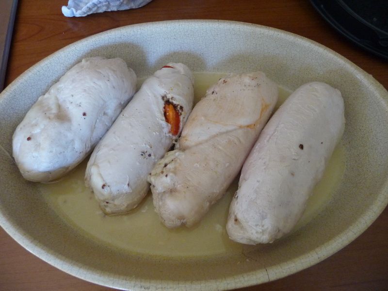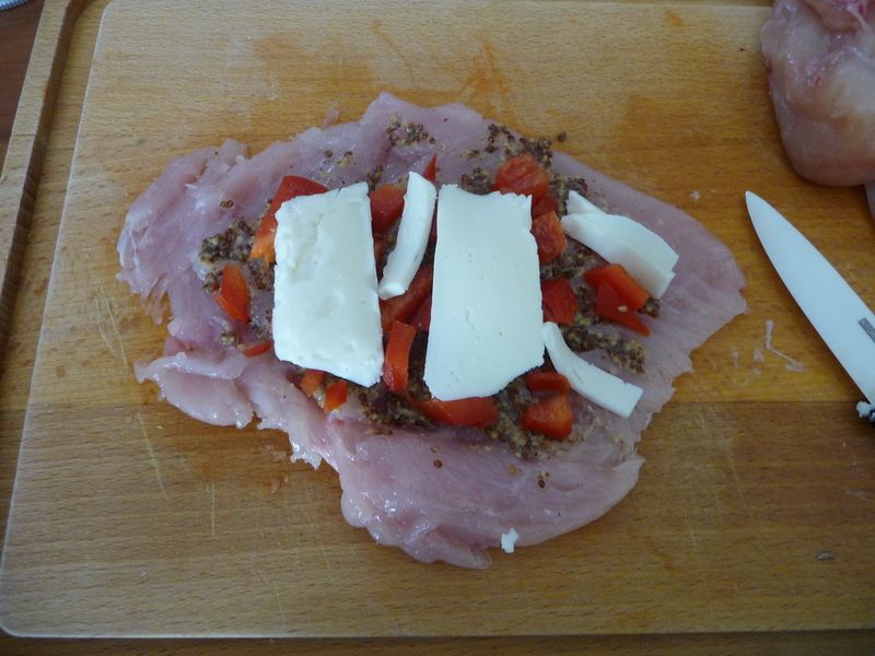 - Pendant ce temps, tartiner chaque escalope avec 1 c à soupe de moutarde à l’ancienne, 1 pincée de sel, 1 pincée de poivre et disposer le poivron rouge et la mozzarella au centre. (Garder de la mozzarella pour la crème et le gratin). Rabattre les bords de chaque escalope pour former un ballotin et envelopper de film alimentaire résistant à la chaleur en serrant bien. Déposer chaque ballotin dans le panier de cuisson.