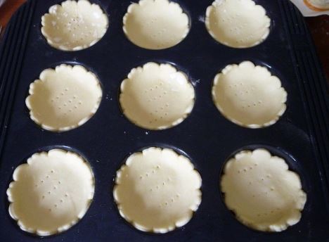 - Tapisser 6 moules à tartelettes de pâtes. Les piquer à la fourchette.