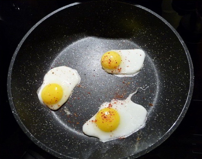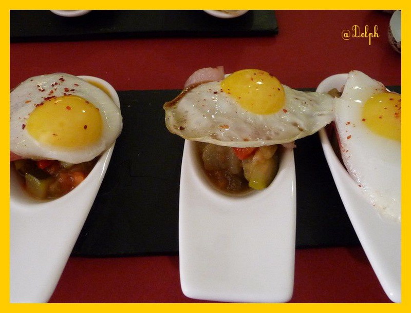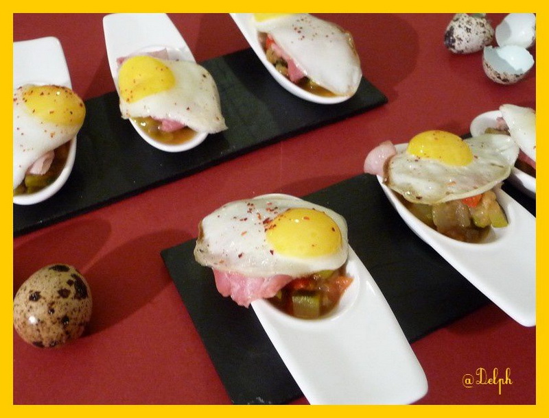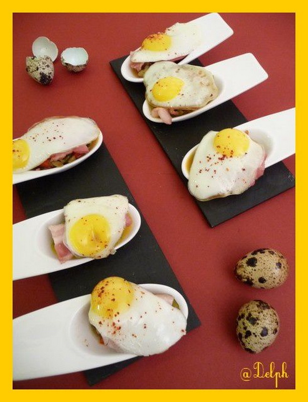 - Verser les légumes dans 12 cuillères, mettre le lard, puis coiffer d’un œuf et poudrer de piment d’Espelette.