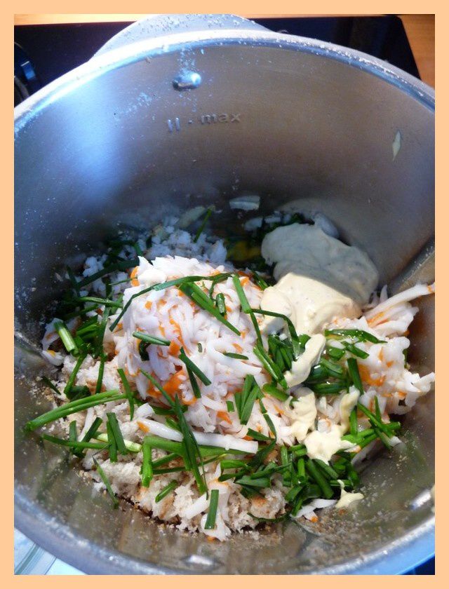 - Mixer votre pain dans un blender, ajouter le crabe émietté, l’oeuf, l’ail épluché et couper en petits morceaux, la mayonnaise, la ciboulette ciselée grossièrement, du sel, du poivre, ajouter l’oignon revenu et mixer. Ne pas trop mixer vous devez avoir encore quelques morceaux.
