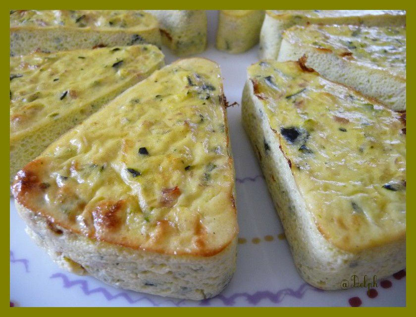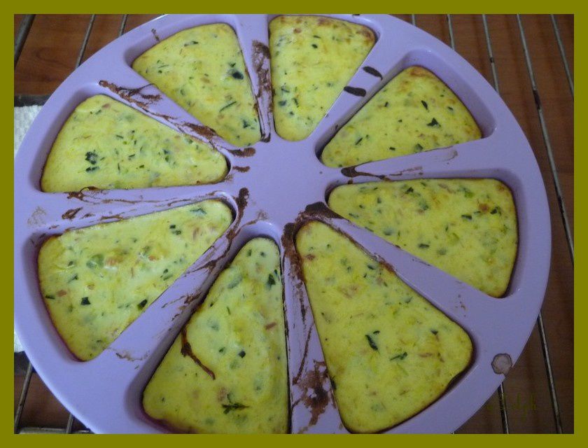 - Verser les courgettes/lardons et la préparation dans un moule à cake et faire cuire environ 30 minutes. Servir tiède ou froid.