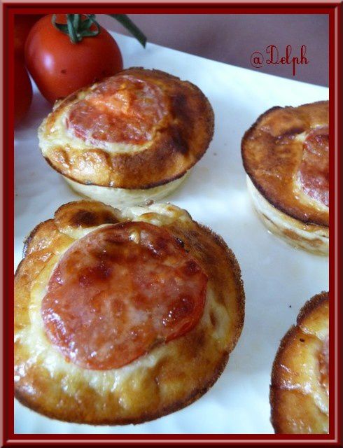 4. Répartir la préparation dans les moules, ajouter la moitié d’une tomate cerise et parsemer de parmesan.