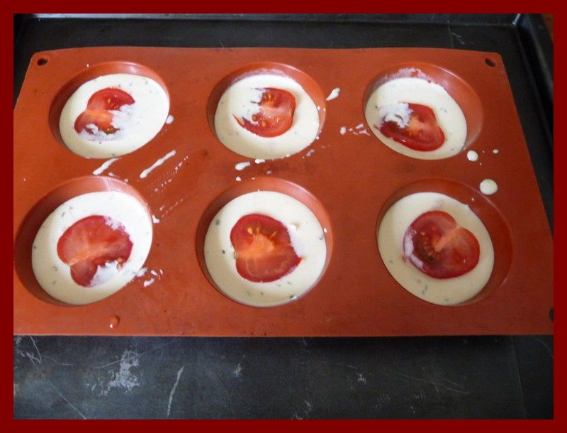 5. Répartir la préparation dans les moules, ajouter la moitié d’une tomate cerise et parsemer de parmesan.