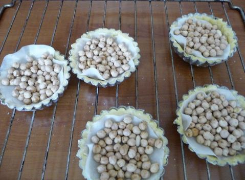- Tapisser 5 moules à tartelette de pâte sablée. Piquer le fond, et couvrir de papier cuisson et de légumes secs.