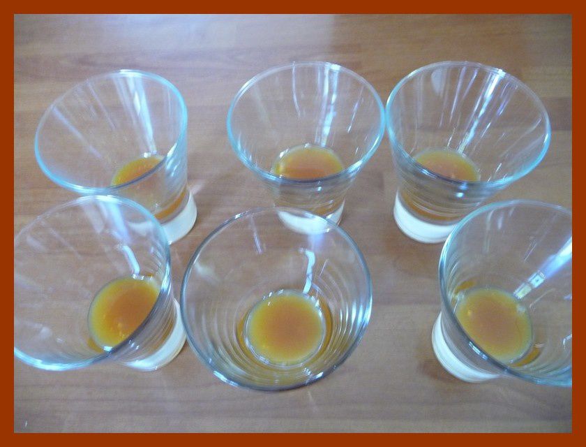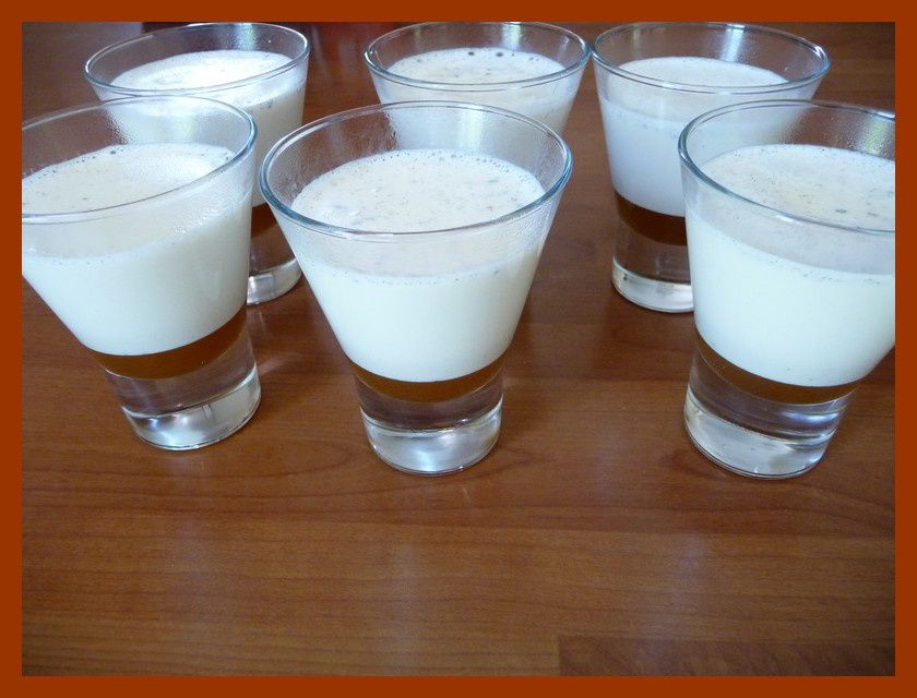 5. Verser un peu de coulis de caramel au fond de vos verrines, verser la panna cotta refroidie sur votre coulis et mettre au frais un minimum de 5 h.