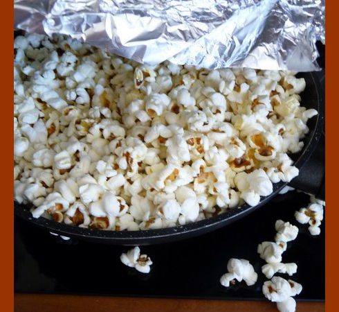 7. Mettre vos grains de maïs dans votre poêle avec un peu d’huile, recouvrir de papier d’aluminium pour bien envelopper la poêle puis faire griller en position maximum, lorsque vous entendez les premiers maïs éclater, baisser le feu puis attendre que tout soit éclaté environ 10 minutes, enlever l’aluminium, saupoudrer de sucre, mélanger.