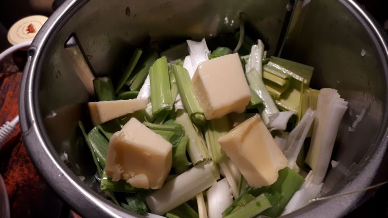 - Laver, éplucher et couper les poireaux en petits tronçons de 2 cm, les ajouter dans le bol avec le beurre et 1 gobelet rempli d’eau. Faire chauffer 12min/Varoma/Vit2, enlever le gobelet au bout de 8 minutes.