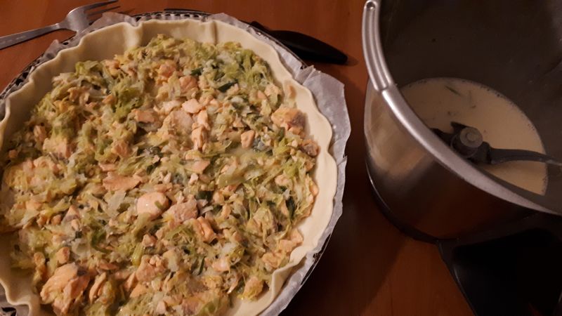- Mettre votre pâte dans le moule et la piquer avec une fourchette. Verser la fondue de poireaux et le saumon sur le fond de tarte (essayer d’enlever le maximum de jus de cuisson).