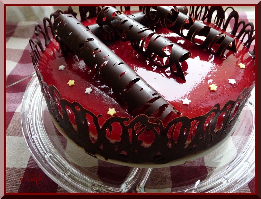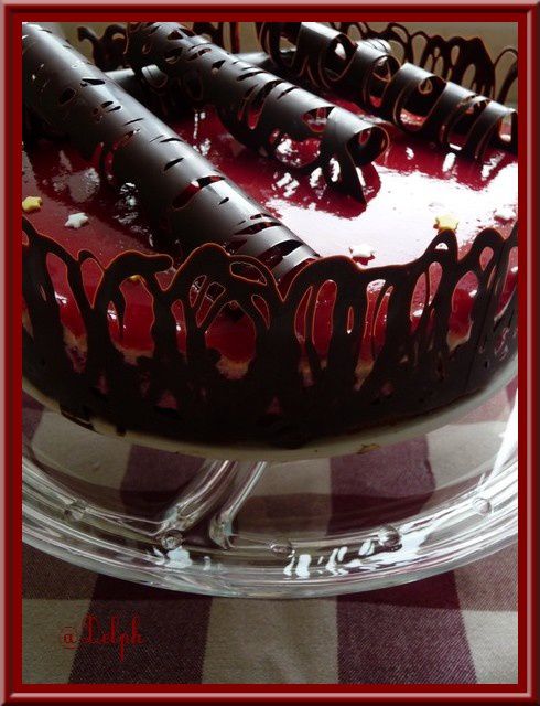 Prendre une feuille guitare, la couper au diamètre du moule, puis faire fondre le chocolat noir à 32°C, ou bien au micro-onde le faire chauffer 40 secondes à 600watt, sortir, remuer et renouveler l’opération deux fois jusqu’à ce que le chocolat soit fondu ensuite le mettre dans un crayon de décoration et faire des boucles, ou autres formes, attendre que cela soit un peu refroidi pour l’appliquer sur le gâteau, replacer le bavarois au frais et attendre que le chocolat durcisse; puis enlever la feuille guitare avant de présenter…
