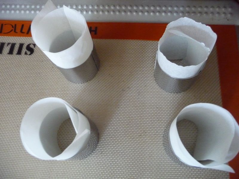 - Préchauffer le four à 200°C, chemiser de papier sulfurisé 4 emportes pièces puis les disposer sur une plaque recouverte de papier sulfurisé.