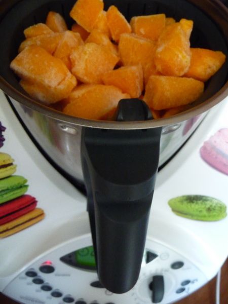 - Mettre votre citrouille coupée en dés dans votre panier cuisson avec un litre d’eau, mettre en position Varoma/15mn/Vit1.