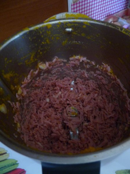 - Inutile de rincer le bol, mettre vos gousses d’ail épluchées dans le bol, mixer 5sec/Vit 5, racler les bords, puis renouveler 5sec/Vit5, ajouter le jambon râpé puis faire chauffer 3min30/90°C/vit1.