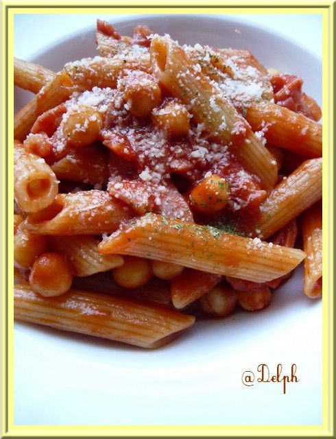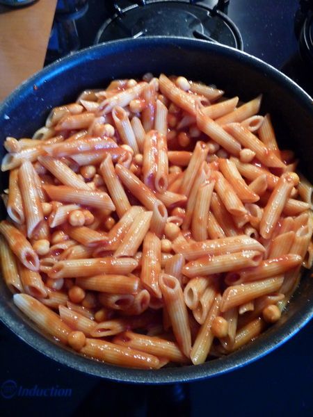- Mélanger les 500g de pâtes avec le coulis de tomate et faire chauffer, ajouter les pois chiches toujours sous feu doux et mélanger.