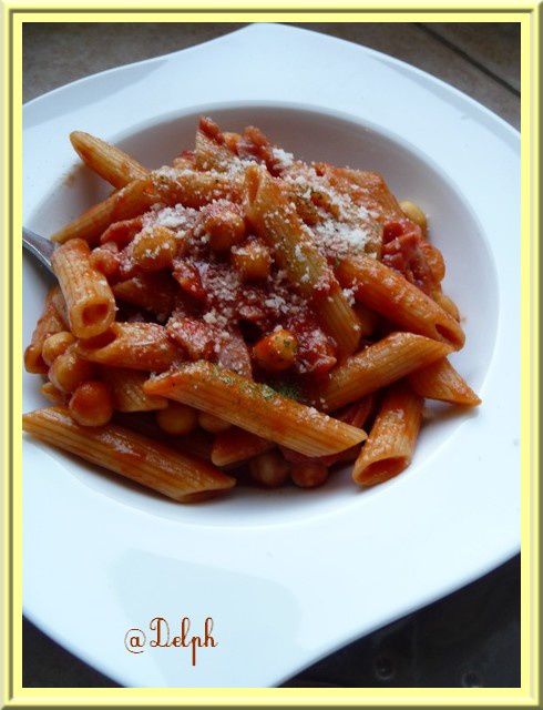 - Mélanger les 500g de pâtes avec le coulis de tomate et faire chauffer, ajouter les pois chiches toujours sous feu doux et mélanger.