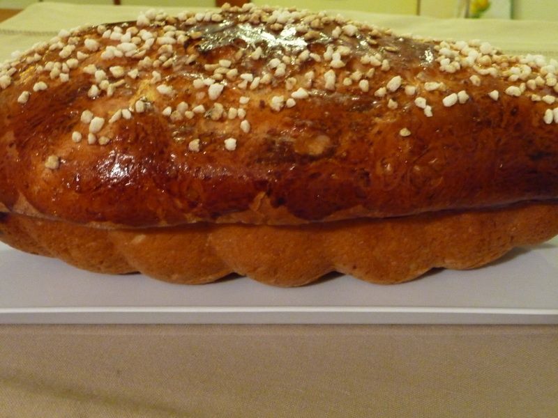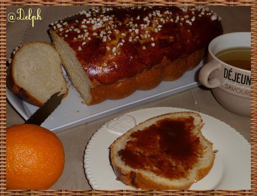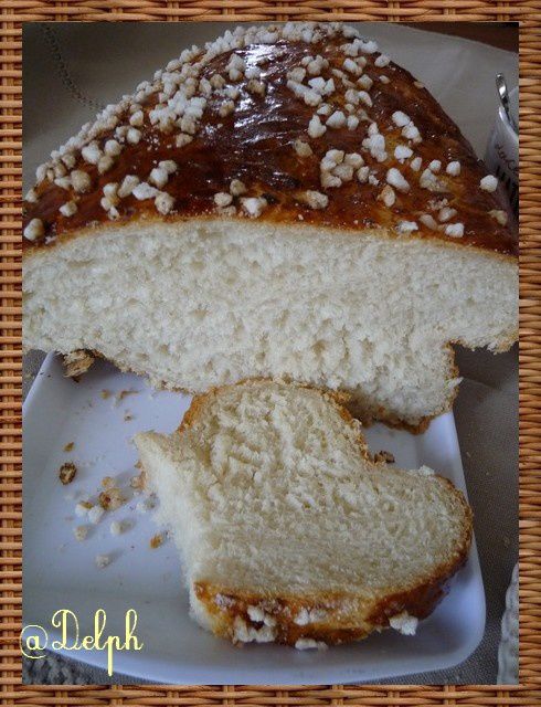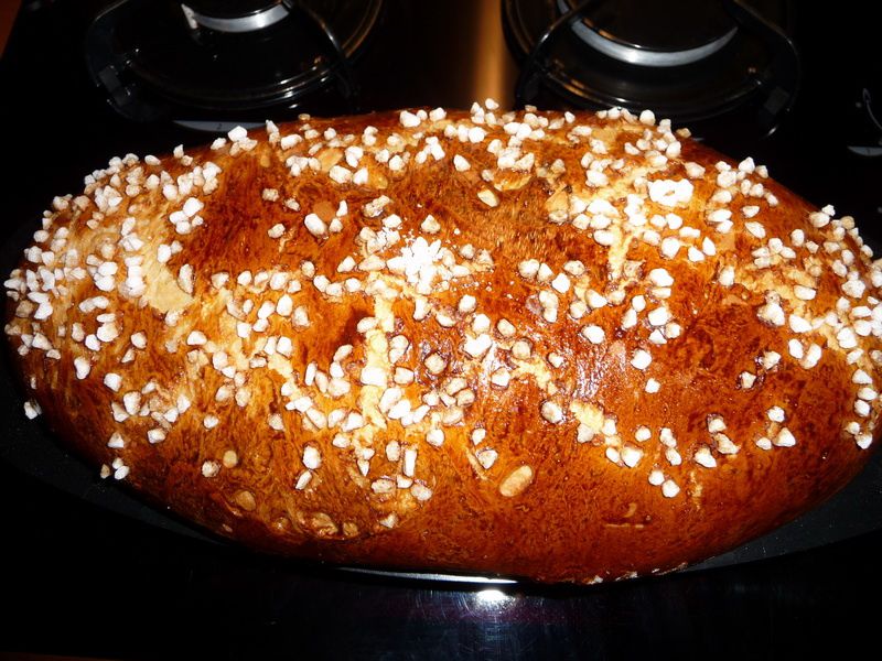 - Badigeonner la brioche d’un jaune d’œuf mélangé avec un peu d’eau de fleur d’oranger, (facultatif) mettre le sucre perlé dessus et mettre au four pour 30mn environ. laisser refroidir avant de déguster,