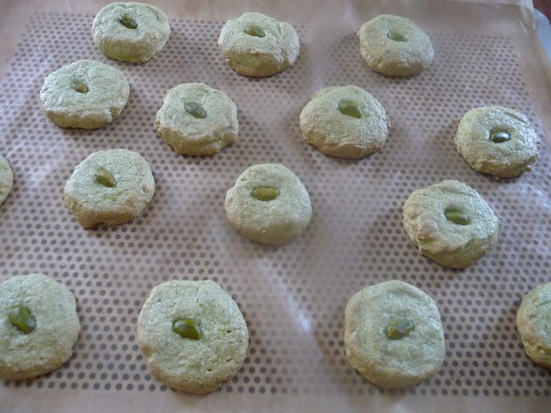 - Aplatir légèrement les amaretti, enfoncer une pistache sur chaque biscuit. et les enfourner à four préchauffé à 160°C