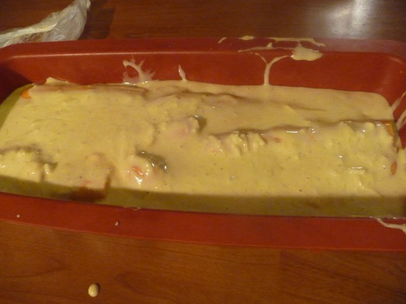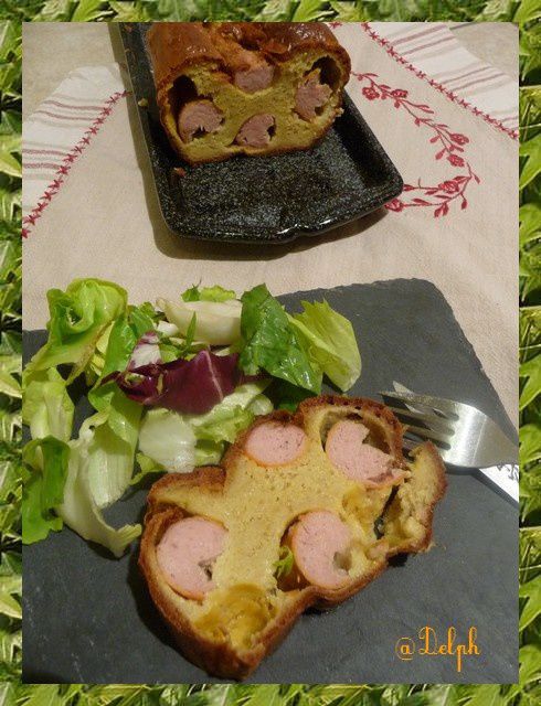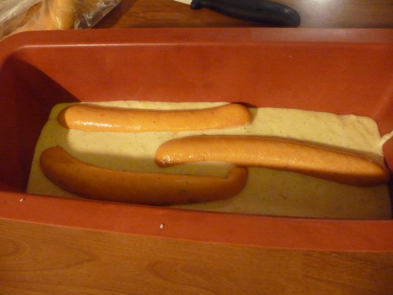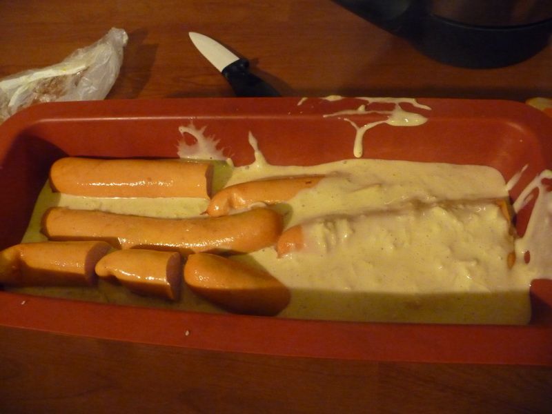 - Dans un moule à cake antiadhésif, verser la base petit à petit en intercalant entre chaque couche les saucisses.