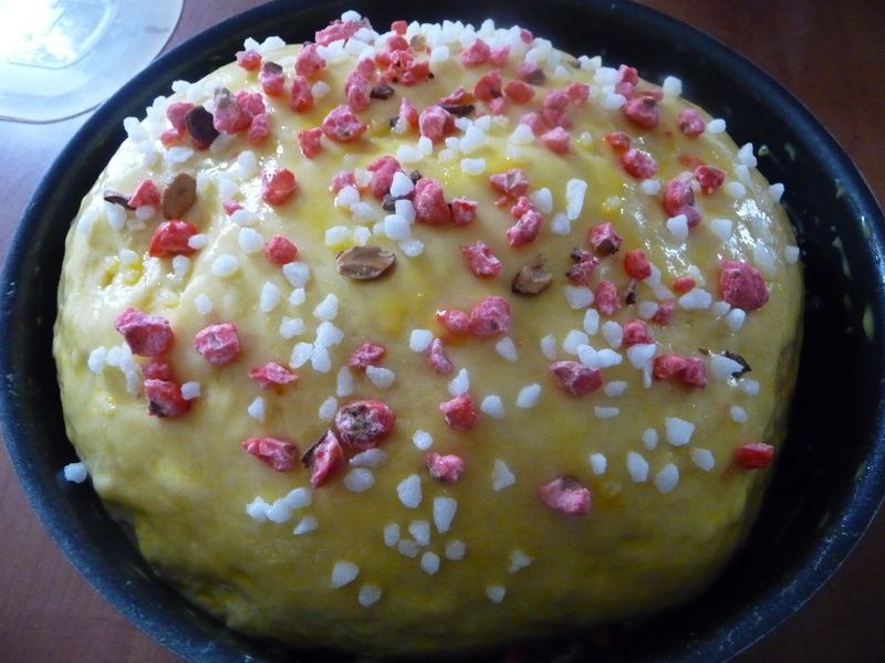 - Mouler la brioche dans un moule anti adhésif de 22cm. Laisser lever 2 heures. Dorer le dessus avec le jaune d’œuf et une cuillère à soupe d’eau. Ajouter quelques pralines entières et du sucre perlé.