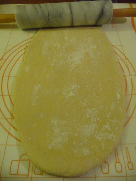 - Le lendemain, étaler la pâte sur une surface farinée, pliez-la en quatre et recommencer cette opération à deux reprises. Ajoutez-y alors 150 g de pralines concassées.