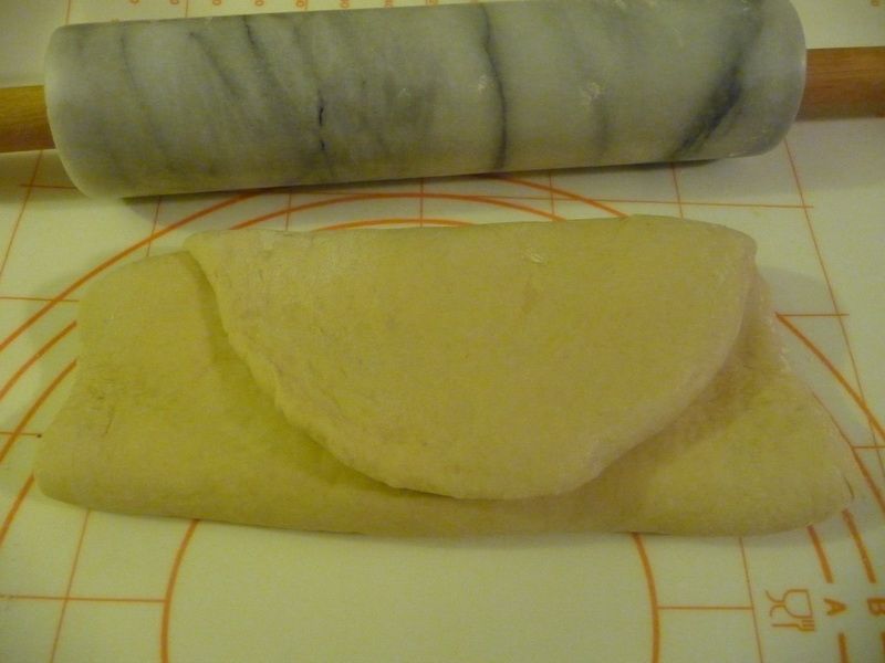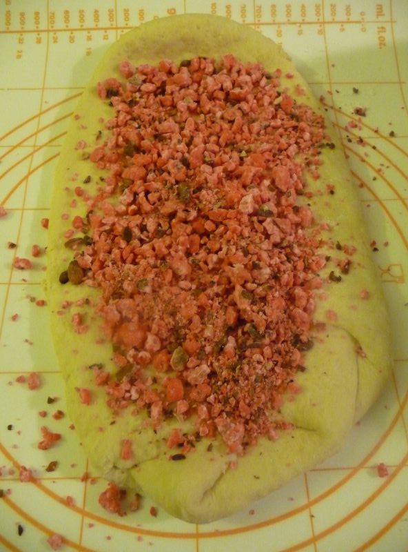 - Le lendemain, étaler la pâte sur une surface farinée, pliez-la en quatre et recommencer cette opération à deux reprises. Ajoutez-y alors 130 g de pralines concassées.
